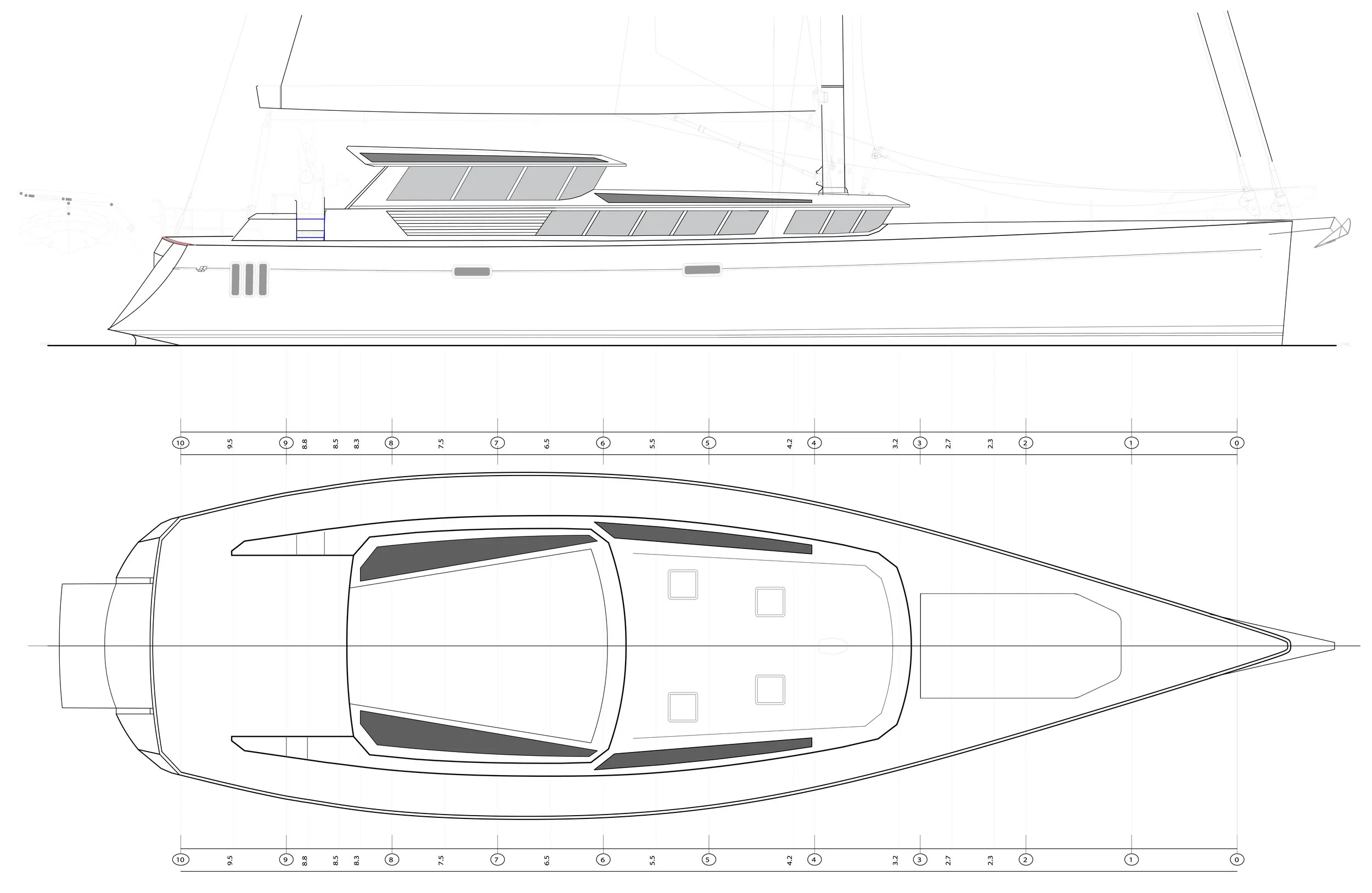 65ft Fast Cruising Yacht preliminary deck plan & side profile.